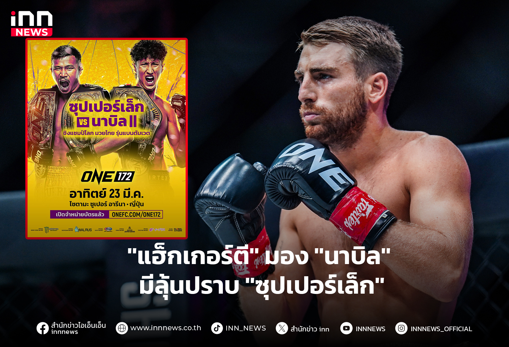 “โจนาธาน แฮ็กเกอร์ตี” แชมป์โลก ONE คิกบ็อกซิ่ง รุ่นแบนตัมเวต (135-145 ป.) จากเกาะอังกฤษ รอจับตาดูไฟต์ ระหว่าง “ซุปเปอร์เล็ก เกียรติหมู่ 9” ราชัน ONE คิกบ็อกซิ่ง รุ่นฟลายเวต (125 – 135 ป.) และมวยไทย รุ่นแบนตัมเวต กับ “นาบิล อานาน” เจ้าของตำแหน่งแชมป์โลกเฉพาะกาล โดยมีเข็มขัด ONE มวยไทย รุ่นแบนตัมเวต เป็นเดิมพัน ในศึก ONE 172 ซึ่งจะถ่ายทอดสดสู่สายตาผู้ชมใน 195 ประเทศทั่วโลก จากสนาม ไซตามะ ซูเปอร์ อารีนา ประเทศญี่ปุ่น ในวันอาทิตย์ที่ 23 มี.ค.นี้ เริ่มเวลา 14.00 น.