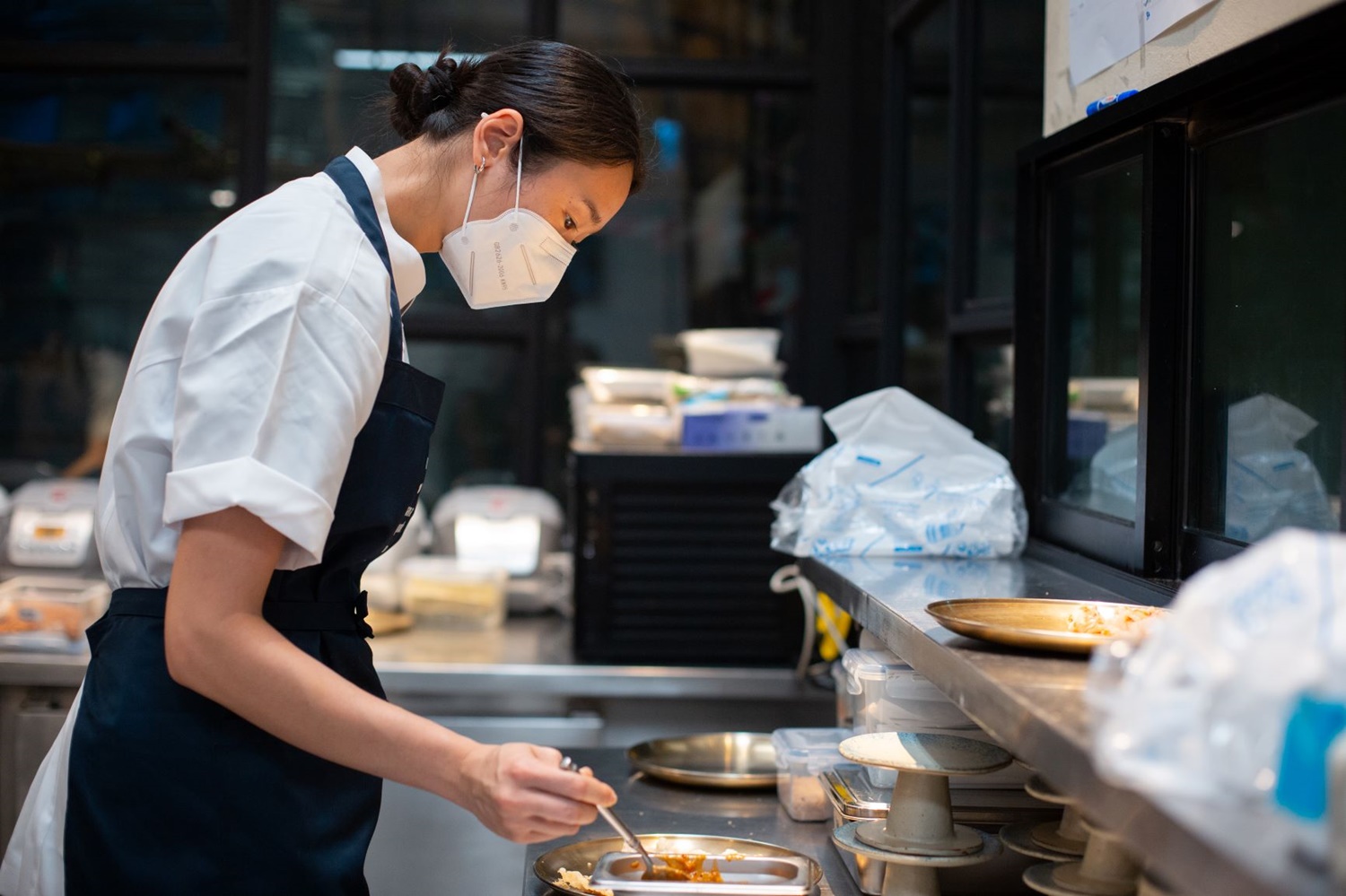 ด้าน ออกแบบ-ชุติมณฑน์ จึงเจริญสุขยิ่ง ที่ต้องฝึกฝนการทำอาหารหลากหลายสไตล์อย่างเชฟมืออาชีพ เพื่อรับบท ออย หญิงสาวที่ชีวิตพลิกผันจากวงการสตรีทฟู้ด มาสู่วงการอาหารไฮเอนด์ เล่าให้ฟังว่า “ตอนที่เตรียมรับบท ออย ในเวิร์กชอปต้องเรียนทุกอย่างใหม่หมด ตั้งแต่การใช้มีด การแล่ปลา ไปจนถึงการใช้กระทะ Wok ที่ตอนแรกยกกระทะไม่ขึ้นเลยเพราะหนักมาก ออกแบบเลยต้องฝึกให้กล้ามเนื้อแข็งแรงขึ้นโดยการพกกระทะไปด้วยตอนออกกำลังกาย เพื่อให้กล้ามเนื้อชินจนสามารถยกกระทะได้ นอกจากนี้ก็มีการฝึกกับเชฟชาลี เป็นอาหารแนว Fine Dining และไปฝึกที่ร้านราดหน้ายอดผัก มาถึงตั้งแต่ตอนเปิดร้าน มาช่วยขายของ มาละลายพฤติกรรมหลายๆ อย่างออกไปเพื่อให้เข้าใจคาแรคเตอร์มากขึ้น แต่ละการฝึกไม่เหมือนกันเลย ทำให้สนุกมากๆค่ะ ตอนทำอาหารก็จะมีเจ็บตัวบ้าง เพราะเราทำอาหารเองจริงๆ ส่วนวันที่เป็นซีนหั่นเนื้อ A5 ก้อนใหญ่ๆ แม้เราจะเรียนหั่นมาก่อนแล้ว แต่ของจริงด้วยอุณหภูมิเนื้อ ด้วยระยะเวลาการถ่ายทำ ทำให้มันละลายไม่พอ เวลาหั่นเลยยากตรงต้องกดมีด ซีนนั้นตอนถ่ายทำออกแบบว่าจะไม่ร้องไห้ เพราะตัวละครเราแข็งแกร่งมาก แต่สุดท้ายน้ำตาไหลออกมาเอง เหมือนเป็นความมหัศจรรย์บางอย่างที่เกิดขึ้นระหว่างถ่ายทำค่ะ” งานนี้ออกแบบการันตีเล่นเอง 100% ทุกซีน