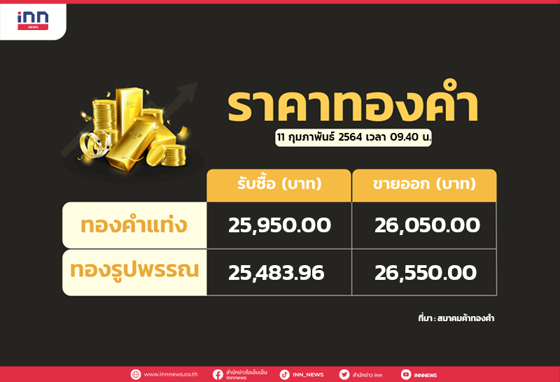 สมาคมค้าทองคำประกาศราคาซื้อ-ขายทอง ประจำวันพฤหัสบดีที่ 11 ก.พ.2564 เมื่อเวลา 09.40 น. ราคาไม่เปลี่ยนแปลง จากราคาวานนี้ โดยทองรูปพรรณ รับซื้อบาทละ 25,483.96 บาท ขายออกบาทละ 26,550.00 บาท ทองคำแท่ง รับซื้อบาทละ 25,950.00 บาท ขายออกบาทละ 26,050.00 บาท