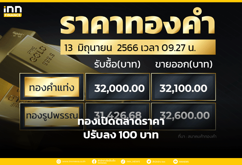 สมาคมค้าทองคำ ประกาศราคาซื้อ-ขายทอง ประจำวันอังคารที่ 13 มิถุนายน 2566 ครั้งที่ 1 เมื่อเวลา 09.27 น. ราคาปรับลง 100 บาท จากราคาวานนี้