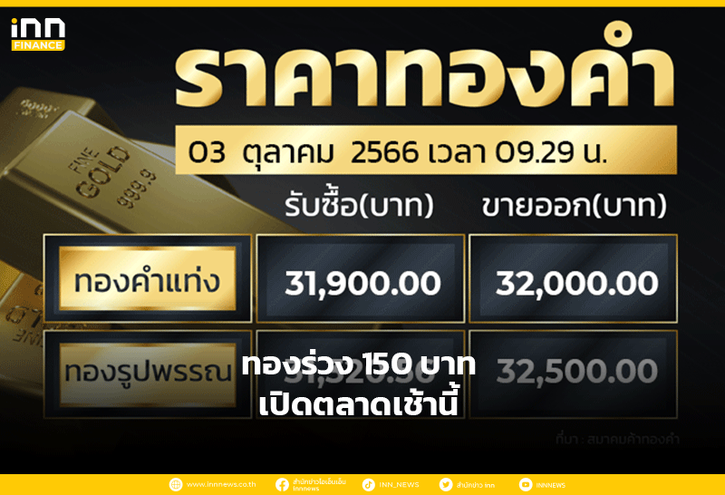 สมาคมค้าทองคำ ประกาศราคาซื้อ-ขายทอง ประจำวันอังคารที่ 3 ตุลาคม 2566 ครั้งที่ 1 เมื่อเวลา 09.29 น. ราคาปรับลง 150 บาท จากราคาวานนี้