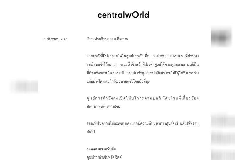 ศูนย์การค้าเซ็นทรัลเวิลด์ แจ้งประชาสัมพันธ์สื่อมวลชน จาก กรณีที่มีประกายไฟในศูนย์การค้าเมื่อเวลาประมาณ16:10 น. ที่ผ่านมา ขอเรียนแจ้งให้ทราบว่า ขณะนี้ เจ้าหน้าที่ประจำศูนย์ได้ควบคุมสถานการณ์เป็น ที่เรียบร้อยภายใน 10 นาที และกลับเข้าสู่ภาวะปกติแล้ว โดยไม่มีผู้ได้รับบาดเจ็บ แต่อย่างใด และกำลังระบายควันโดยเร็วที่สุด โดยศูนย์การค้ายังคงเปิดให้บริการตามปกติ โดยโซนที่เกี่ยวข้องปิดบริการเพียงบางส่วน และขออภัยในความไม่สะดวก และหากมีความคืบหน้าทางศูนย์จะรีบแจ้งให้ทราบ ต่อไป