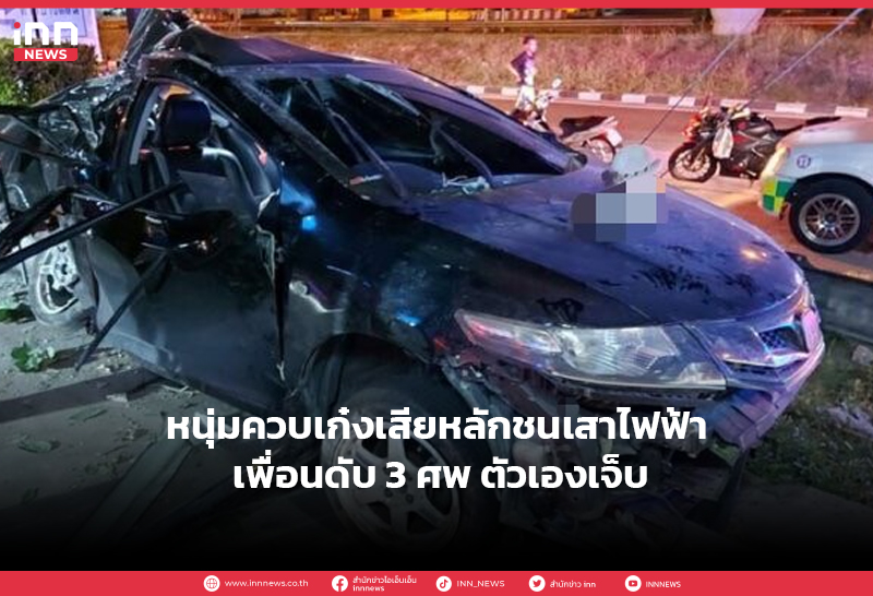 หนุ่มควบเก๋งเสียหลักชนเสาไฟฟ้า เพื่อนดับ 3 ศพ ตัวเองเจ็บ