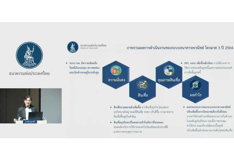 นางสุวรรณี เจษฎาศักดิ์ ผู้อำนวยการอาวุโส ธนาคารแห่งประเทศไทย (ธปท.) รายงานผลการดำเนินงานของระบบธนาคารพาณิชย์ไตรมาส 3/64 ว่า ธนาคารพาณิชย์มีความเข้มแข็งโดยมีเงินสำรอง สภาพคล่อง และเงินกองทุนอยู่ในระดับสูง สามารถทำหน้าที่เป็นกลไกสำคัญในการให้ความช่วยเหลือลูกหนี้และสนับสนุนสินเชื่อเพื่อรองรับการฟื้นตัวของเศรษฐกิจในระยะต่อไปที่ยังมีความไม่แน่นอนสูงแต่คุณภาพสินเชื่อโดยรวมเสื่อมลงเล็กน้อย โดยในไตรมาส 3/64 ผลประกอบการของธนาคารพาณิชย์ทั้งระบบปรับดีขึ้นจากไตรมาสเดียวกันปีก่อนกำไรสุทธิ 38.5 พันล้านบาท เพิ่มขึ้น 45.1% จากไตรมาสเดียวกันปีก่อน