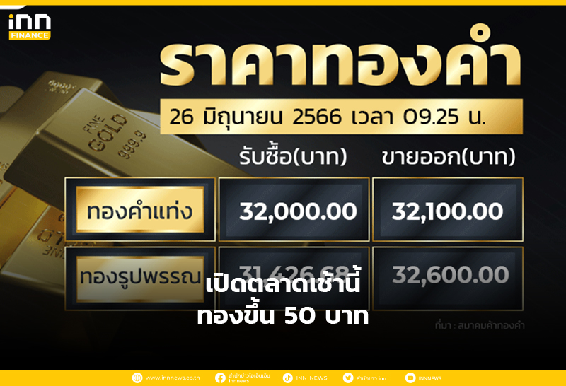 สมาคมค้าทองคำ ประกาศราคาซื้อ-ขายทอง ประจำวันจันทร์ที่ 26 มิถุนายน 2566 ครั้งที่ 1 เมื่อเวลา 09.25 น. ราคาปรับขึ้น 50 บาท จากราคาวานนี้