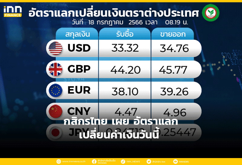 อัตราแลกเปลี่ยนเงินตราต่างประเทศ ของธนาคารกสิกรไทย เวลา 08.19 น. ดอลลาร์สหรัฐ รับซื้อ 33.32 บาท ขายออก 34.76 บาท