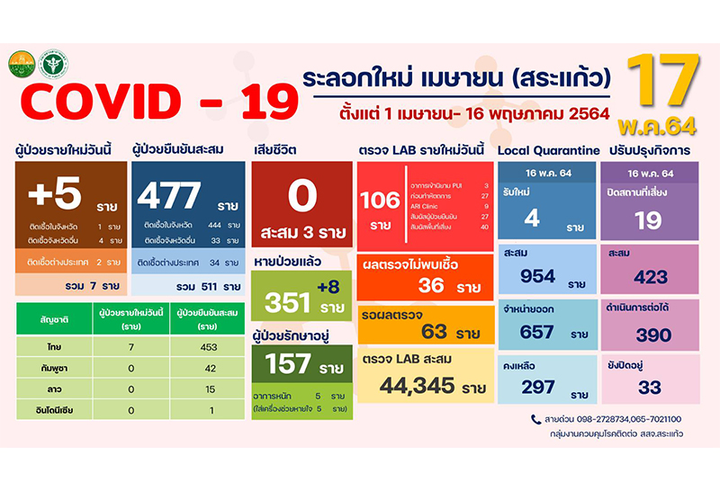 นพ.ประภาส ผูกดวง นายแพทย์สาธารณสุขจังหวัดสระแก้ว เปิดเผยว่า วันนี้ผู้ติดเชื้อรายใหม่ 5 ราย (ติดเชื้อจากในจังหวัด 1 ราย ติดเชื้อจากจังหวัดอื่น 4 ราย) และติดเชื้อจากต่างประเทศ 2 ราย รวมทั้งสิ้น 7 ราย มาจากการคัดกรองเชิงรุกและกลุ่มเสี่ยงสูงที่สัมผัสกับผู้ป่วยยืนยัน เป็นเพศชาย 3 ราย หญิง 4 ราย อายุระหว่าง 17 – 60 ปี ในวันนี้มีผู้สัมผัสเสี่ยงสูง 14 ราย ทำให้การระบาดระลอกใหม่เมษายน 2564 ตั้งแต่วันที่ 4 เมษายน-16 พฤษภาคม 2564 จังหวัดสระแก้วมีผู้ป่วยสะสมทั้งสิ้น 477 ราย ติดเชื้อจากต่างประเทศ 34 ราย เข้ารักษาตัวอยู่ในสถานพยาบาลของรัฐ เอกชน และโรงพยาบาลสนามรวมทั้งสิ้น 157 ราย รักษาหายแล้ว 351 ราย