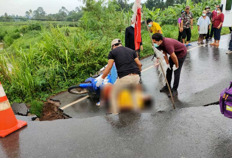 หวิดดับ ! ฝนตกหนักต่อเนื่อง ทำถนนทรุดเกิดรอยแยกขนาดใหญ่ จยย.พลิกคว่ำ เจ็บสาหัส 2 ราย กู้ภัยเร่งช่วยเหลือ