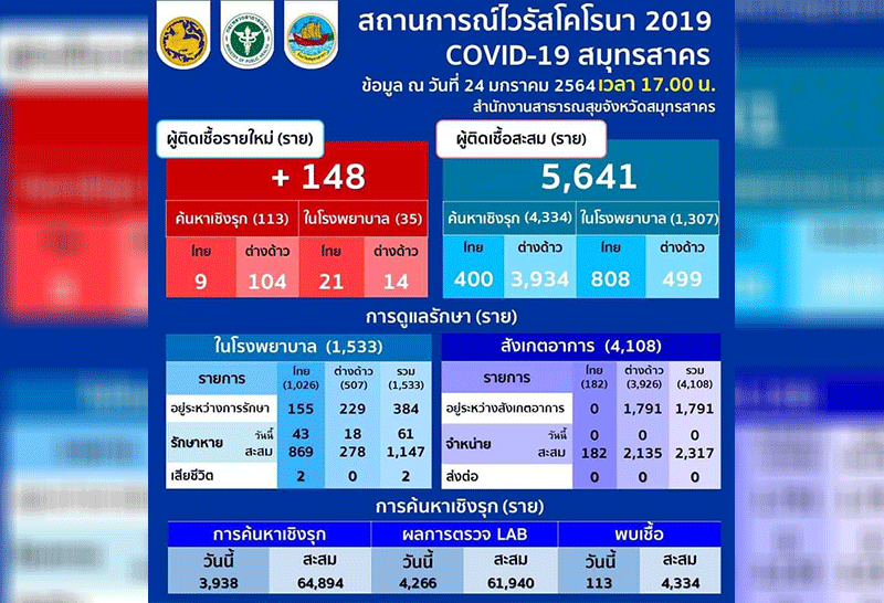 สำนักงานสาธารณสุขจังหวัดสมุทรสาคร เปิดเผยข้อมูลสถานการณ์การแพร่ระบาดของไวรัสโคโรน่า 2019 ประจำวันที่ 24 มกราคมเวลา 17.00 น ว่า จ.สมุทรสาคร พบผู้ติดเชื้อรายใหม่ จำนวน 148 ราย มาจากการค้นหาเชิงรุก 113 ราย เป็นคนไทย 9 ราย ต่างด้าว 104 ราย และ มาจากโรงพยาบาล 35 ราย เป็นคนไทย 21 ราย ต่าวด้าว 14 ราย