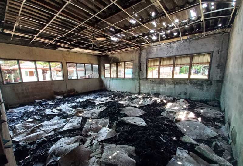 ล่าสุด บ่ายวันนี้ (5 มิถุนายน 2565) ผู้สื่อข่าวได้ลงพื้นที่ไปจุดเกิดเหตุอีกครั้ง ซึ่งสภาพอาคารเรียนดังกล่าว รวมทั้งข้าวของบริจาคถูกไฟไหม้เสียหายทั้งหมด อาคารที่ทำด้วยโครงสร้างคอนกรีตเสริมเหล็ก ฝ้าเพดานหลังคาพังถล่มลงมา กระจกทั้งห้องแตกหมด และมีเศษซากเสื้อผ้าที่ถูกไฟไหม้กองเต็มพื้นห้อง