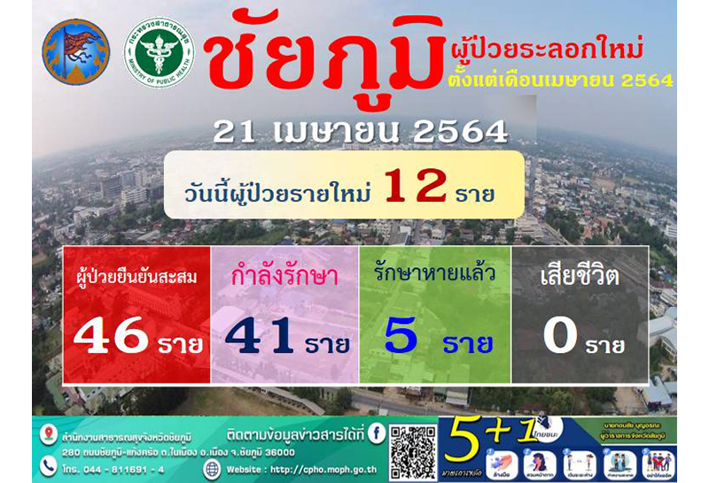 ล่าสุดพบผู้ติดเชื้อรายวันรายใหม่เพิ่มสูงสุดกว่าทุกวันที่ผ่านมาในรอบครึ่งเดือน เม.ย.64 นี้ ถึง 12 รายในวันเดียวกัน ครั้งนี้ทำให้มีผู้ป่วยโควิด-19 สะสมจาก 34 ราย พุ่งทะลุสถิติใหม่ขยับสูงขึ้นรวมเป็น 46 ราย โดยแยกผู้ติดเชื้ออยู่ที่ รพ.ชัยภูมิ จำนวน 34 ราย รักษาหาย 2 ราย และยังรักษาตัวที่ รพ.ภูเขียวเฉลิมพระเกียรติ 8 ราย รักษาหายเตรียมตัวให้กลับบ้านได้อีกจำนวน 3 ราย ที่รพ.แก้งคร้อ จำนวน 2 ราย