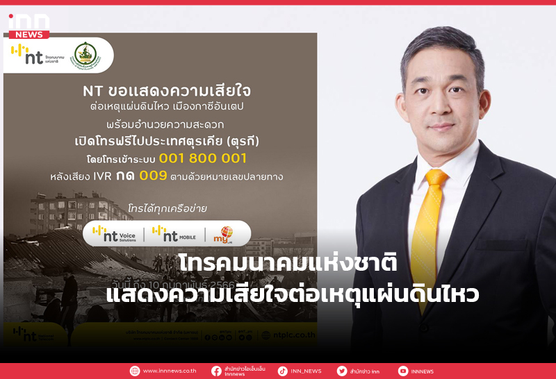 พันเอกสรรพชัยย์ หุวะนันทน์ กรรมการผู้จัดการใหญ่ บริษัท โทรคมนาคมแห่งชาติ จํากัด (มหาชน) หรือ NTขอแสดงความเสียใจต่อเหตุแผ่นดินไหว ที่เกิดขึ้น ณ เมืองกาซีอันเตป ประเทศตุรเคีย (ตุรกี)เพื่อส่งต่อความห่วงใยแก่ญาติของผู้ประสบภัย รวมถึงผู้ที่พักอาศัยหรือ เดินทางไปยังประเทศตุรเคีย NT ขออำนวยความสะดวก ด้วยการเปิดโทรฟรี ไปประเทศ ตุรเคีย (ตุรกี) โดยโทรเข้าระบบ 001 800 001 หลังเสียง IVR กด 009 ตามด้วย หมายเลขปลายทาง ทั้งนี้สามารถโทรได้ทุกเครือข่าย ตั้งแต่วันนี้ จนถึง 10 กุมภาพันธ์ 2566 (*ตามเวลาประเทศไทย)