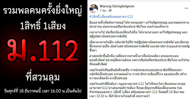 นพ.วรงค์ เดชกิจวิกรม ประธานกลุ่มไทยภักดี ระบุข้อความผ่านเฟซบุ๊กส่วนตัว “Warong Dechgitvigrom” โดยมีใจความว่า 1สิทธิ์1เสียงสนับสนุนมาตรา112 กลุ่มไทยภักดีขอยืนยันถึงจุดยืน การปกครองระบอบประชาธิปที่มีพระมหากษัตริย์เป็นประมุข จะร่วมต่อต้าน การนำนักการเมืองขี้โกงยุยงปลุกปั่นสร้างความเกลียดชังมาเป็นประมุข กลุ่มไทยภักดียืนยันว่า กฎหมายมาตรา112 ไม่ได้รังแกใคร มีแต่คนบางกลุ่ม เอามาตรา112 มาเล่นเกมการเมือง จึงขอเชิญชวนพี่น้องสื่อมวลชน ร่วมกิจกรรมแถลงข่าว 1สิทธิ์ 1เสียง สนับสนุนมาตรา 112 วันพุธที่ 16 ธันวาคม เวลา 10.30 น. ที่สำนักงานไทยภักดี พระราม5