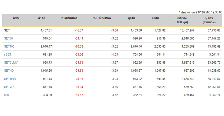 บรรยากาศการลงทุนในตลาดหุ้นไทยช่วงเช้าที่ผ่านมา (21 ธ.ค.) ปิดตลาดดัชนีปรับตัวลดลง 45.37 จุด แตะ 1,437.01 จุด มูลค่าซื้อขาย 67,796.80 ล้านบาท โดยหลักทรัพย์ปรับ เพิ่มขึ้น340 หลักทรัพย์ ลดลง 1,520 หลักทรัพย์ ไม่เปลี่ยนแปลง 130 หลักทรัพย์ ส่วนอัตราแลกเปลี่ยนเงินบาทต่อดอลลาร์สหรัฐ ของธนาคารกสิกรไทย ล่าสุด เมื่อเวลา 11.54 น. มีดังนี้ ดอลลาร์สหรัฐ รับซื้อที่ 28.83บาท ขายออก 29.87 บาท