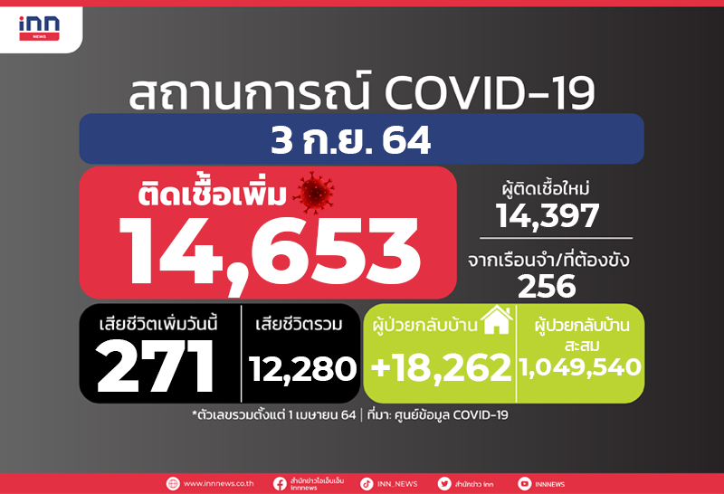 ศูนย์ข้อมูล COVID19 เปิดเผยรายงานล่าสุดเกี่ยวกับสถานการณ์การแพร่ระบาดโควิด 19 ของประเทศไทย ประจำวันศุกร์ที่ 3 ก.ย. 2564 มีผู้ติดเชื้อรายใหม่ รวม 14,653 ราย ลดลงจากวันก่อน โดยแบ่งเป็น ผู้ติดเชื้อทั่วไป 14,397 ราย และ ผู้ติดเชื้อภายในเรือนจำ 256 ราย ทำให้มีผู้ป่วยสะสม 1,249,140 ราย (เฉพาะตั้งแต่ 1 เม.ย. เป็นต้นมา 1,220,277 ราย) และมีผู้เสียชีวิตอีก 271 ราย เพิ่มขึ้นจากวานนี้ รวมมีผู้เสียชีวิตจากโควิด 19 แล้ว 12,374 ราย (เฉพาะตั้งแต่ 1 เม.ย. เป็นต้นมา 12,280 ราย)