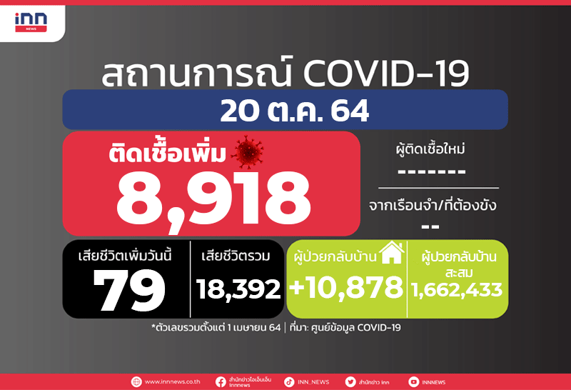 ศูนย์ข้อมูล COVID-19 เปิดเผยรายงานล่าสุดเกี่ยวกับสถานการณ์การแพร่ระบาดโควิด 19 ของประเทศไทย ประจำวันพุธที่ 20 ต.ค. 2564 มีผู้ติดเชื้อรายใหม่