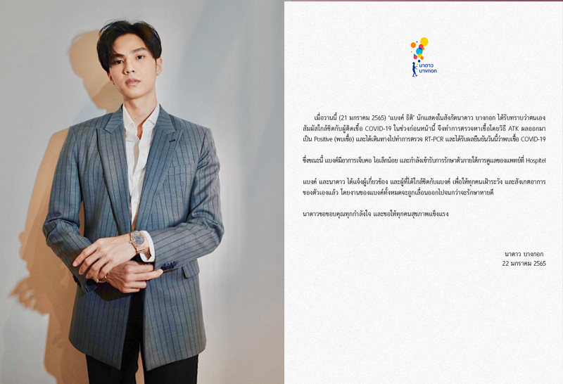 งานนี้ “นาดาว บางกอก” ได้ระบุรายละเอียดว่า… “เมื่อวานนี้ (21 มกราคม 2565) ‘แบงค์ ธิติ’ นักแสดงในสังกัดนาดาว บางกอก ได้รับทราบว่าตนเองสัมผัสใกล้ชิดกับผู้ติดเชื้อ COVID-19 ในช่วงก่อนหน้านี้ จึงทำการตรวจหาเชื้อโดยวิธี ATK ผลออกมาเป็น Positive (พบเชื้อ) และได้เดินทางไปทำการตรวจ RT-PCR และได้รับผลยืนยันวันนี้ว่าพบเชื้อ COVID-19