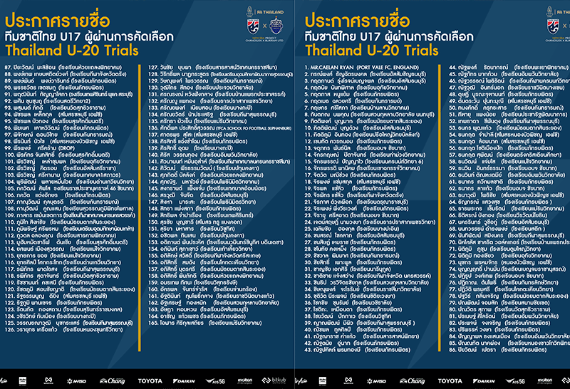 ทาง สมาคมฯ และสโมสร บุรีรัมย์ ยูไนเต็ด จึงขอประกาศรายชื่อ นักกีฬาที่ผ่านการคัดเลือกทั้งหมด 165 คน ดังมีรายชื่อดังต่อไปนี้