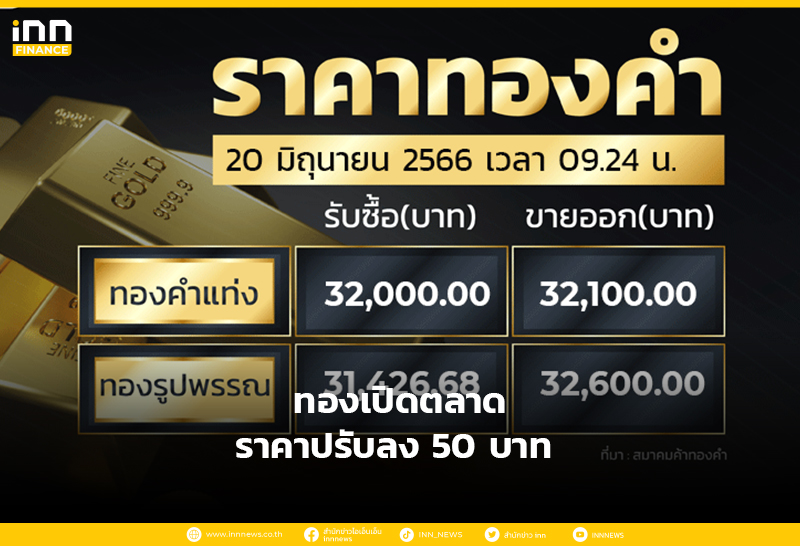 สมาคมค้าทองคำ ประกาศราคาซื้อ-ขายทอง ประจำวันอังคารที่ 20 มิถุนายน 2566 ครั้งที่ 1 เมื่อเวลา 09.240 น. ราคาปรับลง 50 บาท จากราคาวานนี้