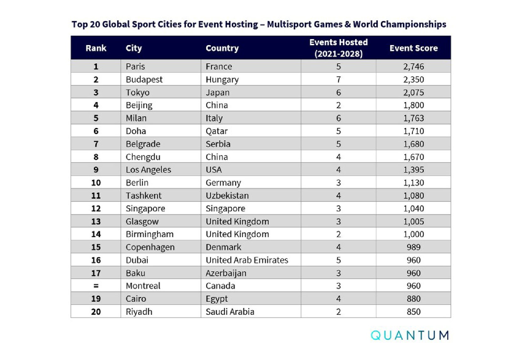 จากการวิเคราะห์ที่ครอบคลุมช่วงเวลาระหว่างปี 2564 ถึง 2571 รายงานดังกล่าวเปรียบเทียบและวิเคราะห์เกมการแข่งขันกีฬาที่ครอบคลุมหลัก ๆ และงานแข่งขันกีฬาระดับโลกที่จัดขึ้นโดยเมืองสำคัญ ๆ ทั่วโลกภายใต้อีโคซิสเต็มของการแข่งขันกีฬาโอลิมปิก จากนั้นรายงานคัดเลือกเมืองต่าง ๆ 60 อันดับแรกทั่วโลกที่มีคะแนนสูงในการเป็นเจ้าภาพการแข่งขันระดับนานาชาติ ในจำนวนเมืองเหล่านี้ กรุงปารีสซึ่งจะเป็นเจ้าภาพการแข่งขันกีฬาโอลิมปิกและพาราลิมปิกในปี 2567 นั้น ครองอันดับหนึ่งในตาราง