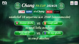 วันที่ 25 เมษายน 2568 เวลา 14.00 น. ณ ห้องเมต้า สโมสรราชพฤกษ์ “น้ำแร่ธรรมชาติตราช้าง” ร่วมกับ สมาคมกีฬาฟุตบอลแห่งประเทศไทย ในพระบรมราชูปถัมภ์ พร้อมด้วย บริษัท ไทยลีก จำกัด และเหล่าพาร์ทเนอร์ ได้แก่ บริษัท โตโยต้า มอเตอร์ ประเทศไทย จำกัด, บริษัท มอลเทน (ไทยแลนด์) จํากัด, บริษัท วอริกซ์ สปอร์ต จำกัด (มหาชน) และบริษัท ไทยเซ็นทรัลเคมี จำกัด (มหาชน) ระเบิดศึกฟุตบอลถ้วยประวัติศาสตร์ที่ไม่มีที่ว่างสำหรับผู้แพ้ รายการ ช้าง เอฟเอ คัพ 2024/25 จัดพิธีจับสลากประกบคู่การแข่งขันฟุตบอลถ้วยประวัติศาสตร์ รอบรองชนะเลิศ