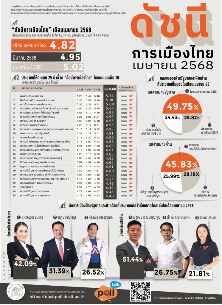 ดัชนีการเมืองไทย เดือนเมษายน 2568 ภาพรวมคะแนนเต็ม 10 ได้ 4.82 คะแนน (เดือนมีนาคม 2568 ได้ 4.95 คะแนน), โดยประชาชนให้คะแนน 25 ตัวชี้วัด “ดัชนีการเมืองไทย” คะแนนเต็ม 10 โดยคะแนนมากสุด ผลงานของฝ่ายค้าน 5.34 คะแนน รองลงมา สิทธิและเสรีภาพของประชาชน 5.18 คะแนน ส่วนคะแนนน้อยที่สุด การแก้ปัญหาความยากจน 4.40 คะแนน