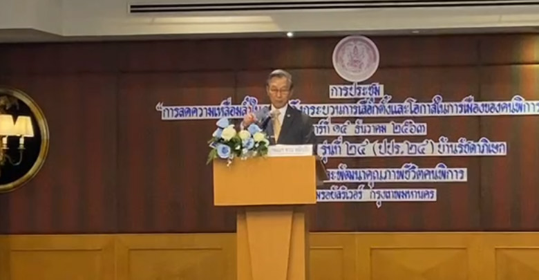 นายชวน หลีกภัย ประธานสภาผู้แทนราษฎร กล่าวปาฐกถา ในหัวข้อการความเหลื่อมล้ำในกระบวนการเลือกตั้งและให้โอกาสในทางการเมืองให้กับผู้พิการว่า ถือเป็นเรื่องที่ดีที่การจัดการเลือกตั้งให้ความสำคัญกับผู้พิการ ในฐานะที่ คนกลุ่มนี้ก็เป็นหนึ่งในพลเมืองของประเทศ เพราะการเลือกตั้งเป็นหัวใจของประชาธิปไตย ภายใต้รัฐธรรมนูญฉบับต่างๆ ที่กำหนดให้พลเมืองต้องมีส่วนทางการเมือง เพื่อให้ประชาธิปไตยเข้มแข็งเกิดการเมืองสุจริต แต่สิ่งที่สำคัญต้องทำให้การเลือกตั้งที่จะเกิดขึ้น สุจริต เที่ยงธรรม ไม่ซื้อสิทธิ์ขายเสียง หากสภาผู้แทนราษฎรมาด้วยความสุจริต ก็จะได้รัฐบาลที่มีความสุจริตด้วยเช่นกัน อย่างไรก็ตามการเมืองเป็นสิ่งที่อยู่คู่กับประเทศเรามาอย่างยาวนาน ภายใต้ระบอ ประชาธิปไตยอันมีพระมหากษัตริย์เป็นประมุข แต่แม้ว่าการปกครองจะเปลี่ยนไปตามยุคตามสมัย แต่การปกครองแบบนี้ก็ไม่เคยเกิดการทำร้ายประชาชนหรือทำให้ประเทศเสียหาย ในทางกลับกันทำให้ปัจจุบันนี้ประเทศไทยเป็นที่ยอมรับ ดังนั้นประเทศไทยจึงจะไม่มีการเปลี่ยนแปลงเป็นระบอบประธานาธิบดีหรือระบอบสาธารณรัฐแต่อย่างไร พร้อมย้ำว่าการเมืองกับปัญหาเป็นของคู่กัน แต่ทุกคนทุกฝ่ายต้องอยู่ภายใต้ของกฎหมาย แต่หากกฎมายไม่ดีก็ต้องแก้ ถ้ายังไม่แก้หรือยังไม่ยกเลิกกฎหมายก็ยังคงศักดิ์สิทธิ์อยู่เช่นเดิม