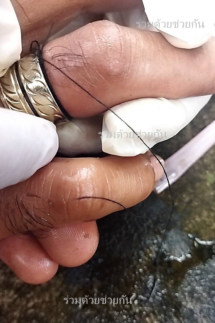 อาสาเข้าตรวจสอบ พบแหวนติดนิ้วนางด้านขวา จำนวน 2 วง มีอาการบวม อาสาใช้อุปกรณ์ คีมและเครื่องเจียขนาดเล็กตัดแหวนได้สำเร็จ สามารถถอดแหวนออกจากนิ้วได้อย่างปลอดภัย
