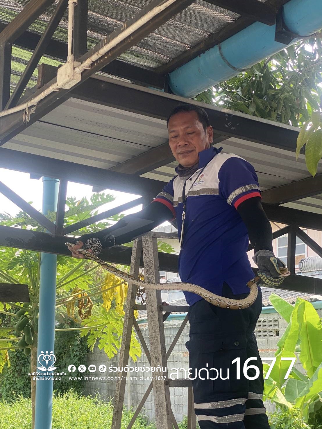 งูเหลือมซ่อนตัวอยู่บนคานใต้หลังคา ถ.รามอินทรา อาสาร่วมด้วยเร่งช่วยเหลือ