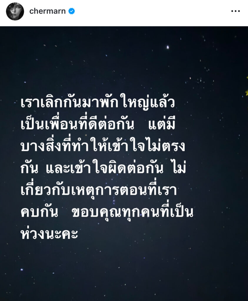 และได้โพสต์เสริมว่า “เราเลิกกันมาพักใหญ่แล้ว เป็นเพื่อนที่ดีต่อกัน แต่มีบางสิ่งที่ทำให้เข้าใจไม่ตรงกัน และเข้าใจผิดต่อกัน ไม่เกี่ยวกับเหตุการตอนที่เราคบกัน ขอบคุณทุกคนที่เป็น ห่วงนะคะ”