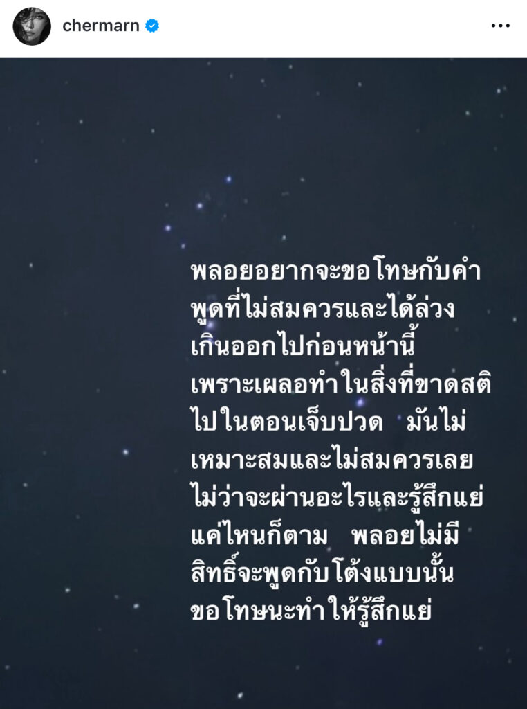 “พลอยอยากจะขอโทษกับคำพูดที่ไม่สมควรและได้ล่วงเกินออกไปก่อนหน้านี้ เพราะเผลอทำในสิ่งที่ขาดสติ ไปในตอนเจ็บปวด”