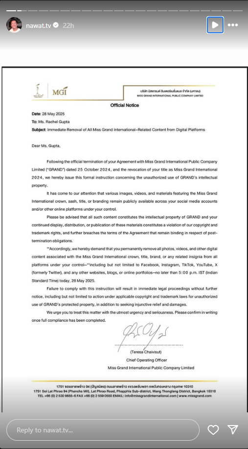 ทางด้าน “บอส ณวัฒน์” ก็ไม่รอช้า กางหลักฐานฟาดแบบเต็มเป้า โดยได้โพสต์สตอรี่แนบคลิปบ้านหลังใหญ่โตโอ่อ่ากว้างขวางที่ “เรเชล” เคยอยู่ทั้งยังถามด้วยว่านี่มันเล็กสำหรับเธอหรอ? และได้โพสต์ภาพเอกสารคำสั่งให้ลบเนื้อหาทั้งหมดที่เกี่ยวข้องกับ Miss Grand International ออกจากแพสตฟอร์มดิจิตอล เนื่องจากนื้อหาดังกล่าวถือเป็นทรัพย์สินทางปัญญาของบริษัท และการเผยแพร่ แจกจ่าย หรือใช้ประโยชน์ใด ๆ ต่อไปถือเป็นการละเมิดลิขสิทธิ์และสิทธิในเครื่องหมายการค้า รวมถึงเป็นการผิดข้อตกลงที่ยังคงมีผลบังคับใช้แม้จะยกเลิกสัญญาไปแล้ว หากไม่ดำเนินการตามคำสั่งนี้ บริษัทขอสงวนสิทธิ์ในการดำเนินคดีตามกฎหมายทันที รวมถึงการเรียกร้องค่าเสียหายและขอคำสั่งห้ามทางศาล