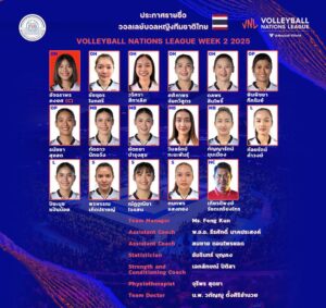 สมาคมกีฬาวอลเลย์บอลแห่งประเทศไทย ประกาศรายชื่อนักกีฬาวอลเลย์บอลหญิงทีมชาติไทย ชุดเข้าร่วมการแข่งขันวอลเลย์บอลหญิงเนชันส์ลีก 2025 (Volleyball Nations League 2025) สัปดาห์ที่ 2 ซึ่งจะจัดขึ้นระหว่างวันที่ 18–22 มิถุนายน 2568 ณ เขตปกครองพิเศษฮ่องกง สาธารณรัฐประชาชนจีน