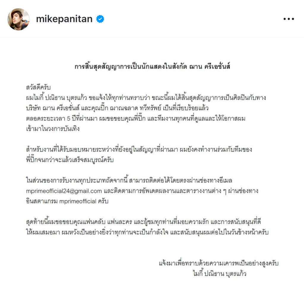 ผมไมกี้ ปณิธาน บุตรแก้ว ขอแจ้งให้ทุกท่านทราบว่า ขณะนี้ผมได้สิ้นสุดสัญญาการเป็นศิลปินกับทางบริษัท ฌาน ครีเอชั่นส์ และคุณปิ๊ก ฌาณฉลาด ทวีทรัพย์ เป็นที่เรียบร้อยแล้ว ตลอดระยะเวลา 5 ปีที่ผ่านมา ผมขอขอบคุณพี่ปิ๊ก และทีมงานทุกคนที่ดูแลและให้โอกาสผมเข้ามาในวงการบันเทิง