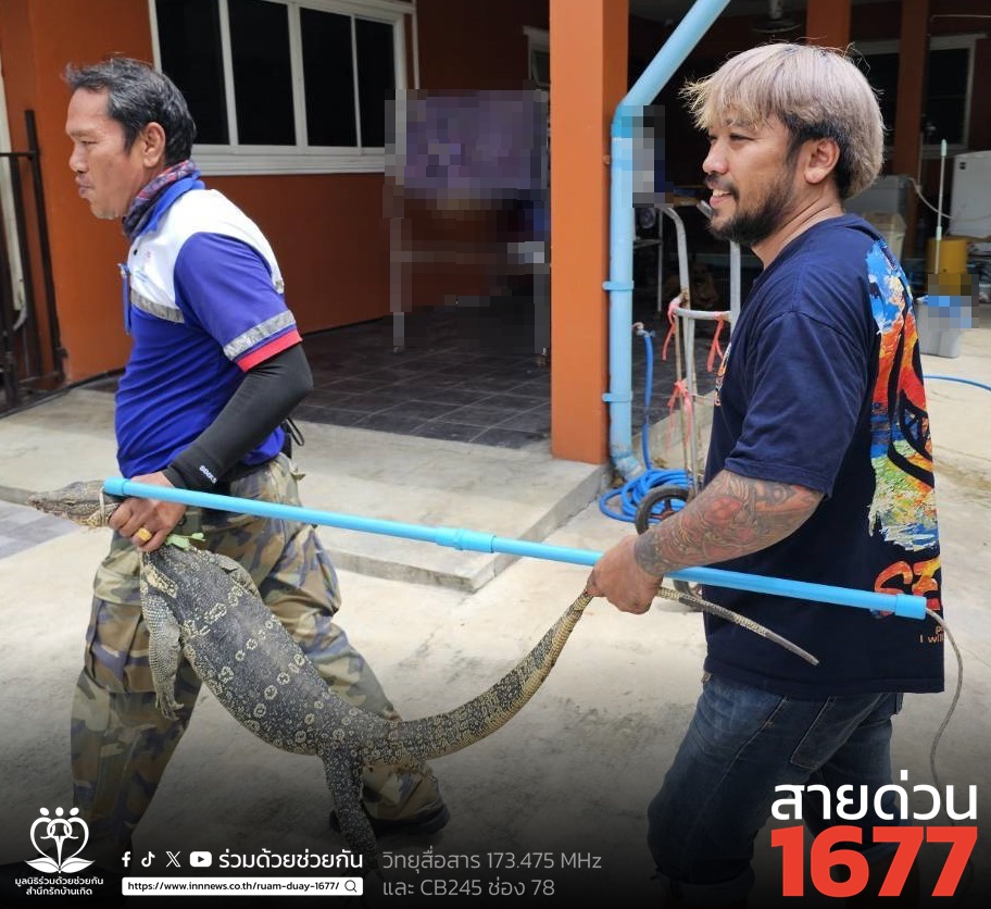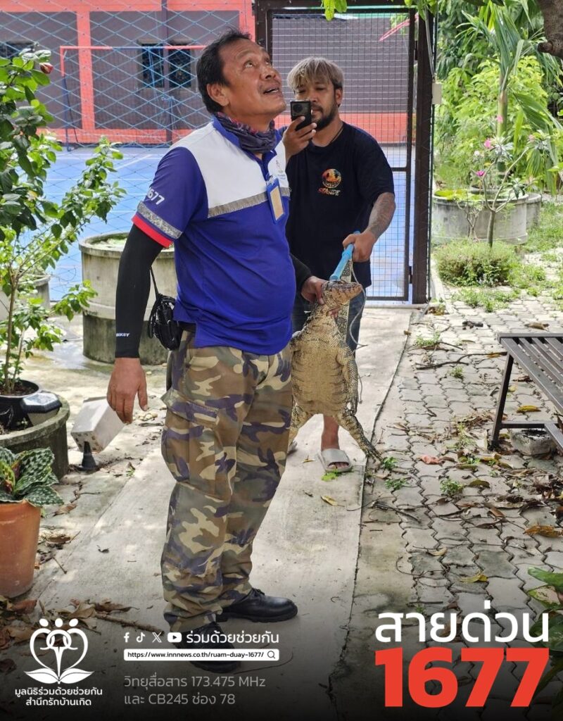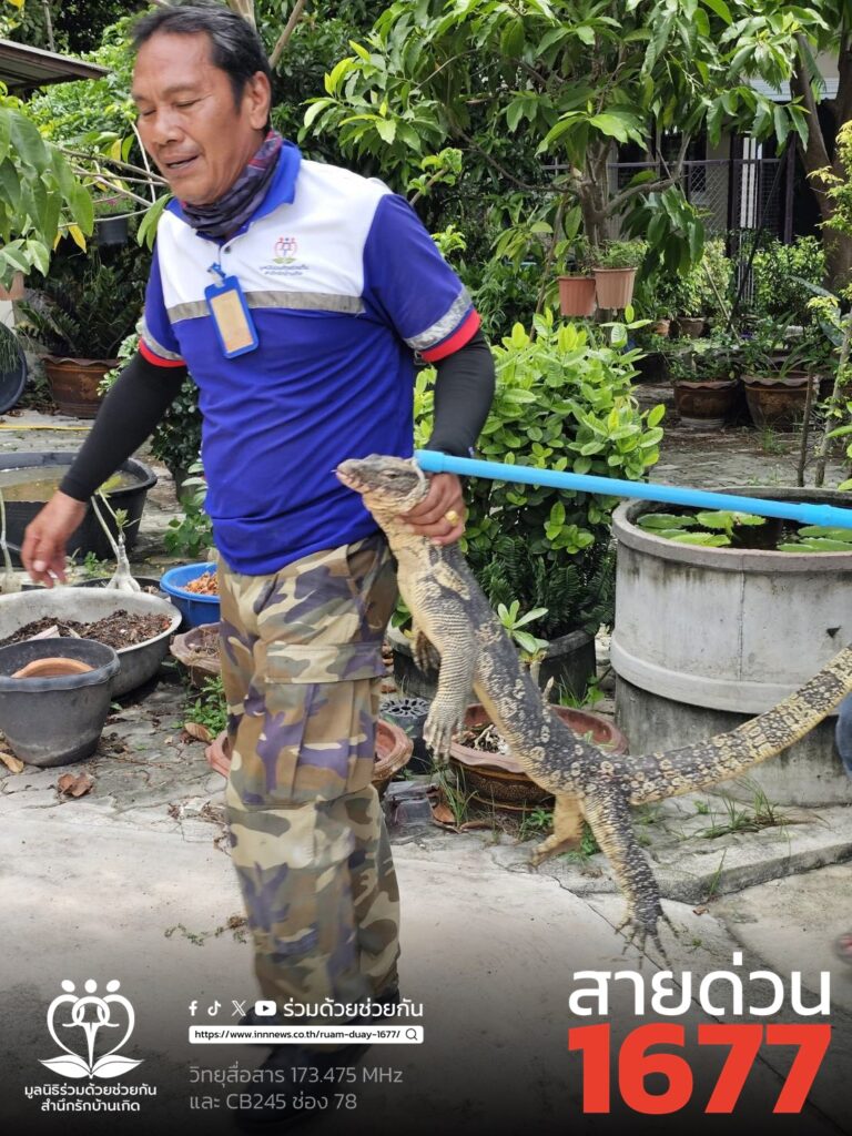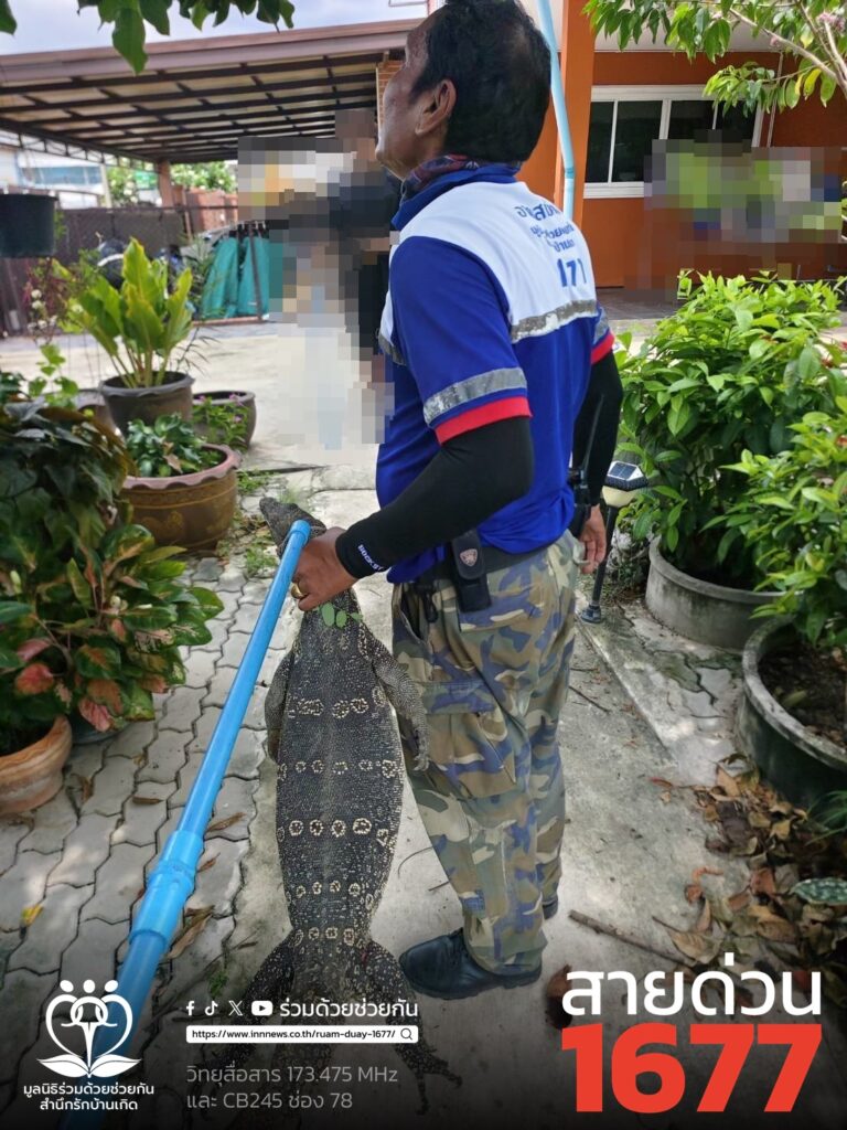 อาสาร่วมด้วยคุ้มภัย 006,032 ได้เข้าตรวจสอบพบเป็นตัวเงินตัวทองจำนวน 1 ตัว ความยาวประมาณ 2 เมตร หลบซ่อนตัวอยู่ข้างโอ่งน้ำข้างบ้านพัก จึงได้นำอุปกรณ์เข้าช่วยเหลือ ทำการคล้องจับตัวนำออกมาได้เป็นผลสำเร็จ และนำไปปล่อยคืนสู่ธรรมชาติเป็นที่เรียบร้อย พื้นที่ สน.บางชัน