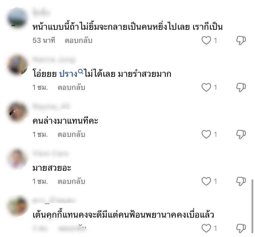 ซึ่งชาวเน็ตก็ตำหนิอาทิว่า “บ่ะได้เลย,น่าจะยิ้มซักหน่อย จะสวยกว่านี้,โอ่ยยย ปรางไม่ได้เลย มายรำสวยมาก,น้องไม่ยิ้มเลยค่ะ ดูแล้วไม่มีมนต์ขลังเลย”