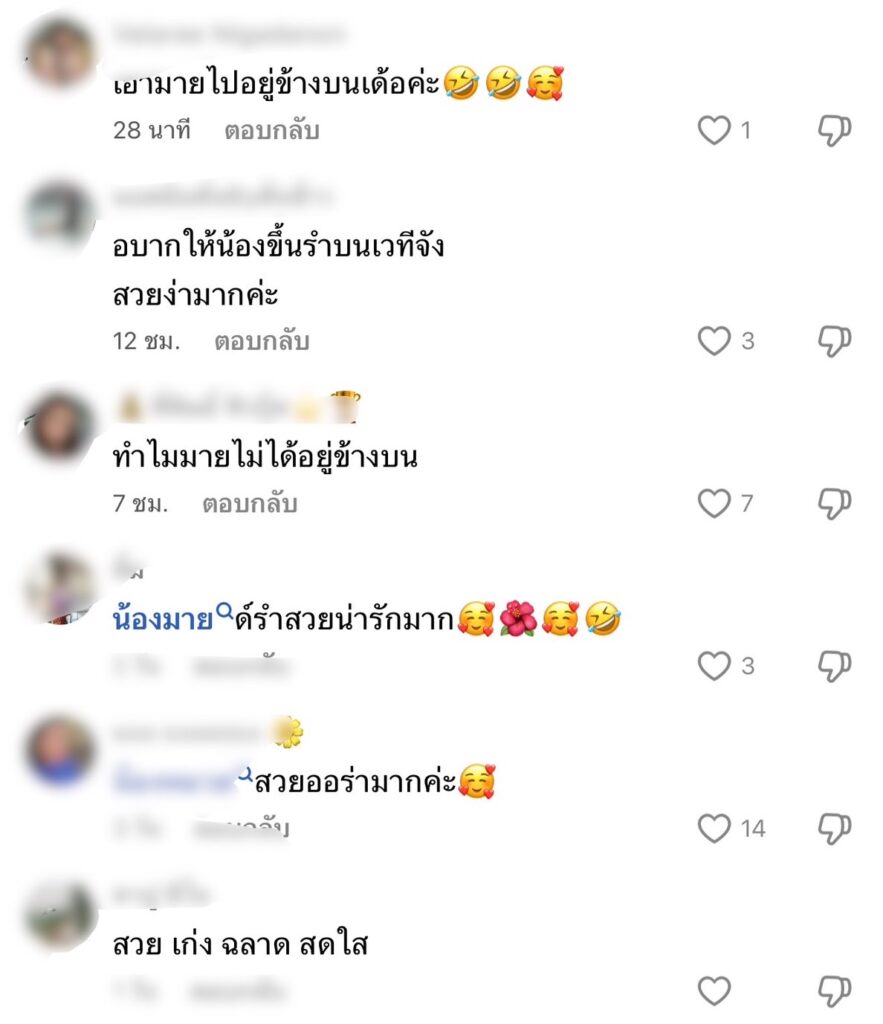 ดูเหมือนเรื่องจะจบแต่ไม่จบสิค่ะ เมื่อมีชาวเน็ตเอามาเปรียบเทียบกับสาว “มายด์” ว่าทางด้านสาว “มายด์” รำสวยกว่า ออร่าจับทั้งที่อยู่ข้างล่าง โดยคอมเมนต์อาทิ “ ทำไมมายไม่ได้อยู่ข้างบน,เอามายไปอยู่ข้างบนเด้อค่ะ, มายรำสวยมาก วันนี้”