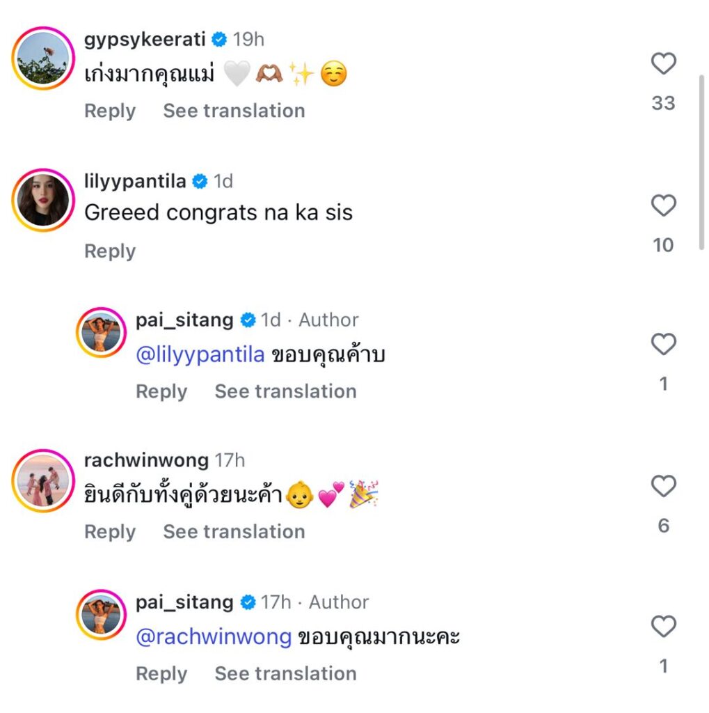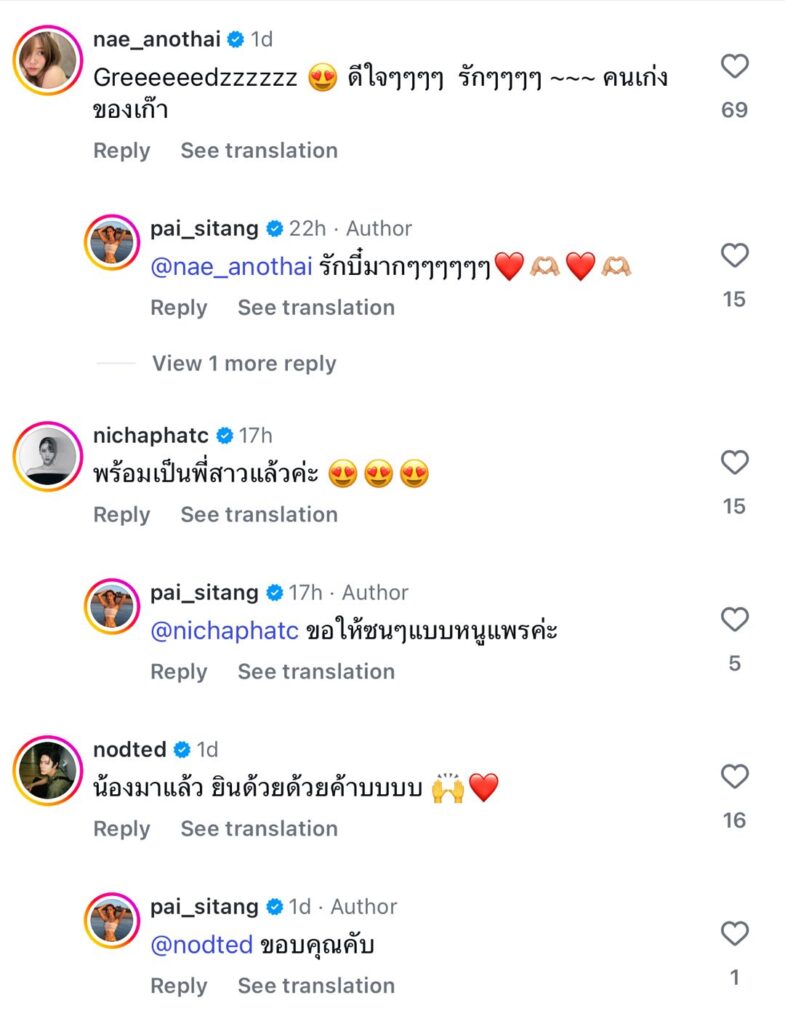 งานนี้เพื่อนๆ ในวงการบันเทิงต่างเข้ามาแสดงความยินดีอย่างล้นหลาม อาทิ “Greeeeeedzzzzzz ดีใจๆๆๆๆ รักๆๆๆๆๆ ~~ คนเก่งของเก๊า , พร้อมเป็นพี่สาวแล้วค่ะ , น้องมาแล้ว ยินด้วยด้วยค้าบบบบ , เก่งมากคุณแม่ , Greeed congrats na ka sis , ยินดีกับทั้งคู่ด้วยนะค้า , Congrats sis , ดีใจด้วยน้องงงงง”