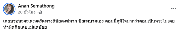 ขณะเดียวกันนักแสดงรุ่นใหญ่ “อ้วน อนันต์” หรือ “อ้วน รีเทิร์น” ก็ได้โพสต์รูปภาพสมัยที่ยังบวชพร้อมทั้งระบุข้อความเกี่ยวกับเรื่องนี้ว่า “เคยบวชนะคะเคร่งครัดทางสินัยสงฆ์มาก บิณฑบาตเอง ตอนนี้ภูมิใจมากว่าตอนเป็นพระไม่เคยทำผิดศิลเลยแม่แต่น้อย”