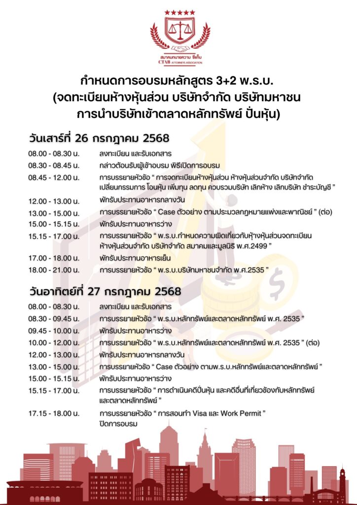 สมาคมทนายความ CTAB เตรียมจัดอบรมหลักสูตรเข้มข้น “(3+2) พ.ร.บ. (จดทะเบียนห้างหุ้นส่วน บริษัทจำกัด บริษัทมหาชน การนำบริษัทเข้าตลาดหลักทรัพย์ และคดีปั่นหุ้น)” เพื่อเสริมสร้างความเข้าใจด้านกฎหมายธุรกิจไทยแบบรอบด้านให้แก่ เจ้าของธุรกิจ นักลงทุน ทนายความ นักบัญชี และผู้ที่ทำงานเกี่ยวข้องกับกฎหมาย แบบครบจบใน 2 วัน! 26–27 กรกฎาคม 2568 ณ โรงแรมมารวย การ์เด้น กรุงเทพฯ