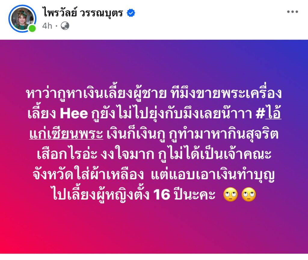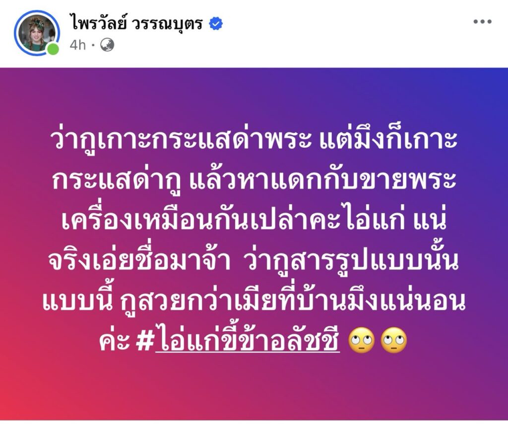 “แพรรี่ ไพรวัลย์” โพสต์เดือดปมเกาะกระแสด่าพระ ลั่นทำมาหากินสุจริต