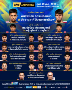 ศึก ONE ลุมพินี 122 เตรียมมอบความสนุกให้กับแฟนมวยเต็มขั้น พร้อมถ่ายทอดสดจากสนามมวยเวทีลุมพินี (รามอินทรา) ส่งถึงผู้ชมใน 195 ประเทศทั่วโลก ในวันศุกร์ที่ 29 ส.ค.นี้ เริ่มคู่แรก 19.30 น. โดยโดยนักสู้ทั้ง 22 คน ผ่านเกณฑ์การชั่งน้ำหนักและวัดระดับน้ำในร่างกายเป็นที่เรียบร้อย และจะสู้กันในพิกัดน้ำหนักตามที่ตกลงไว้ในสรุปผลด้านล่าง
