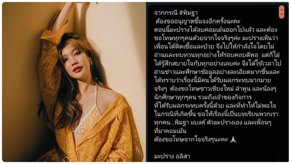 นักแสดงสาว "มะปราง อลิสา" ขอโทษจากใจทัวร์ลงดราม่าให้กำลังใจ "พิมฐา" ลั่นถือเป็นบทเรียน แจงต่อไปนี้จะไต่ตรองให้มากขึ้น