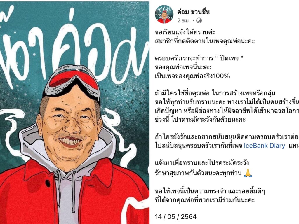ไอซ์ ณพัชรินทร์ ประกาศปิดเพจ “ค่อม ชวนชื่น” อย่างถาวร หวั่นมิจฉาชีพแอบอ้าง แฟนคลับแห่เมนต์เสียดาย