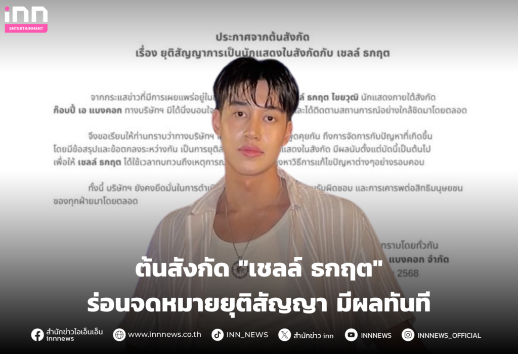 ฉาวอีกราย! ต้นสังกัด "เชลล์ ธกฤต" ร่อนจดหมายประกาศยุติสัญา หลังมีดราม่ากระแสร้อน มีผลทันที