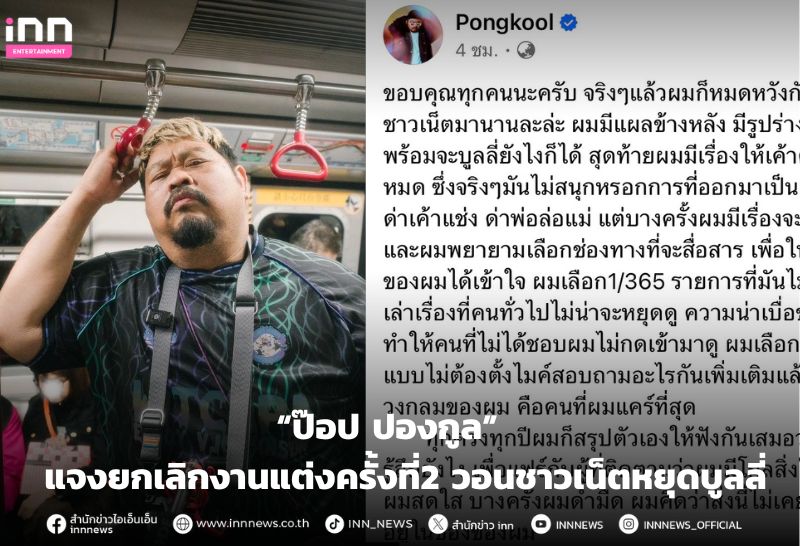 “ป๊อป ปองกูล” แจงยกเลิกงานแต่งครั้งที่2 วอนชาวเน็ตหยุดบูลลี่