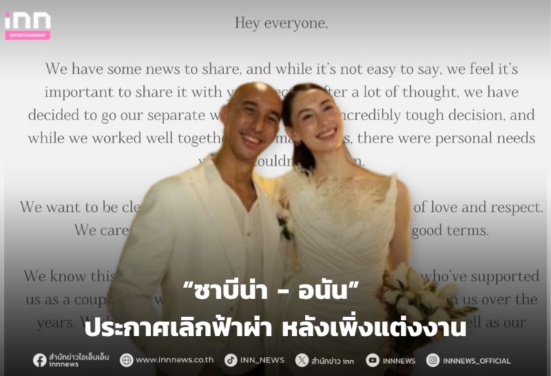 ช็อกวงการ! “ซาบีน่า - อนัน” ประกาศเลิกฟ้าผ่า หลังเพิ่งแต่งงาน ยันจบด้วยดี เป็นการตัดสินใจร่วมกัน