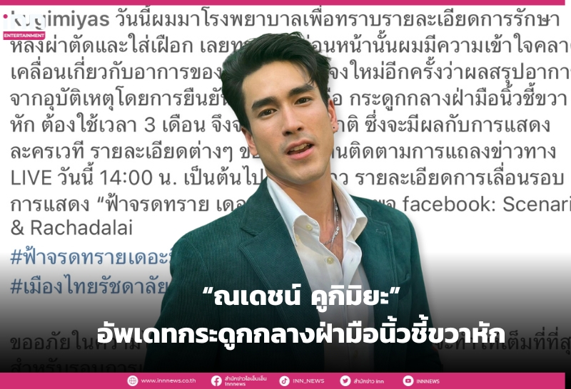 “ณเดชน์ คูกิมิยะ” อัพเดทกระดูกกลางฝ่ามือนิ้วชี้ขวาหัก ลั่นใช้เวลาหาย3ด. ส่งผลกระทบต่อละครเวที