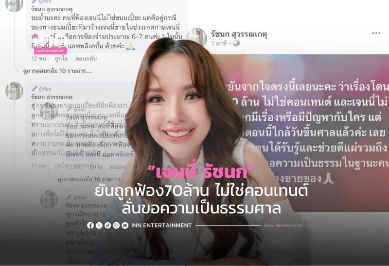 นักร้องสาว ”เจนนี่ รัชนก“ ยันถูกฟ้อง70ล้าน ไม่ใช่คอนเทนต์ ลั่นขอความเป็นธรรมศาล เพราะตนไม่มีส่วนเกี่ยวข้องกับแบรนด์ แค่เป็นผู้รับจ้างไลฟ์