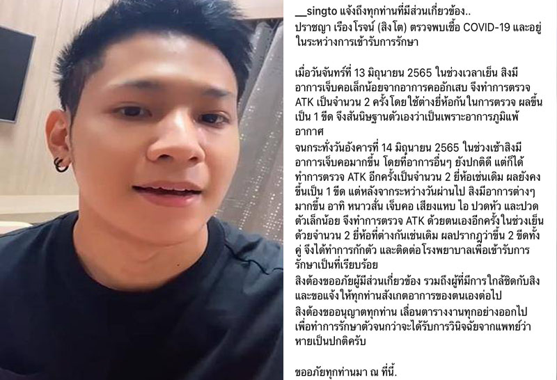 "สิงโต ปราชญา" แจ้งติดเชื้อโควิด-19 เข้ารักษาตัวแล้ว ขอโทษทุกคนที่ใกล้ชิด ขอเลื่อนงานไปก่อน